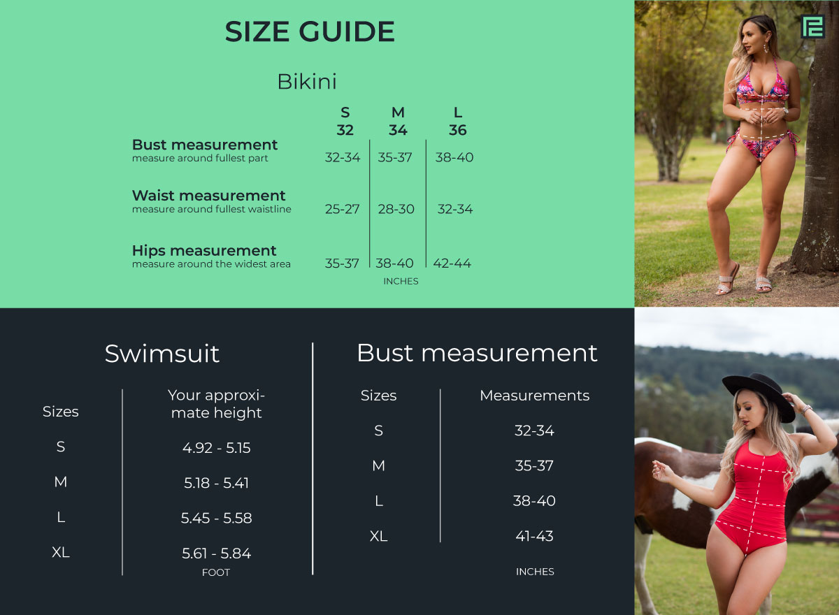 To find out which size is right for you, you must measure the contour of your bust, waist, hips and inseam length (inseam length is only necessary for One Pieces). Compare it to our size chart and voila!